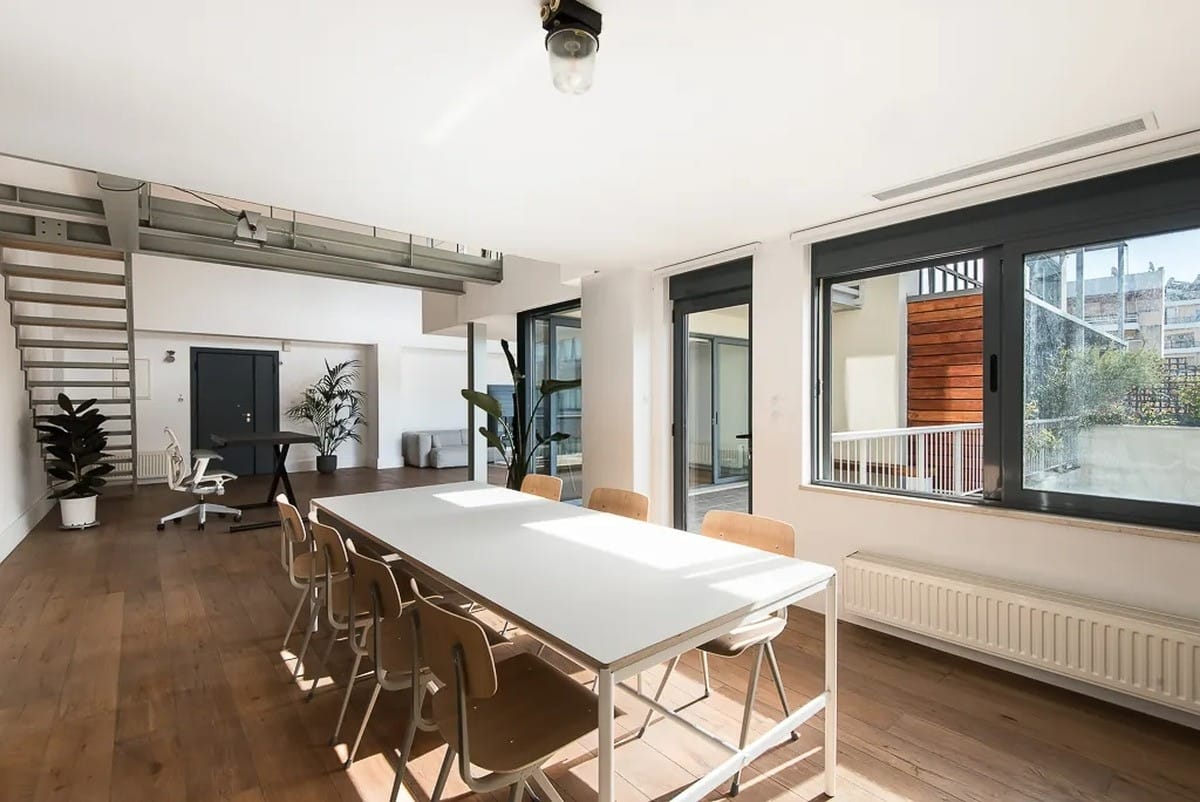 A designer loft in the Gazi area of Athens, near restaurants, cafes, and museums is available for lease. This spacious apartment features two floors, one large room, two bathrooms, and a balcony. Only a 10-minute walk from the metro, train station, and the city's largest bike path, this location is perfect for those who want to be close to transportation. Housed in a beautifully renovated neoclassical building from 2006, this loft was further updated in 2020. Additional amenities include a parking lot, doorman service during the day, and security at night, as well as access to a shared gym within the building.