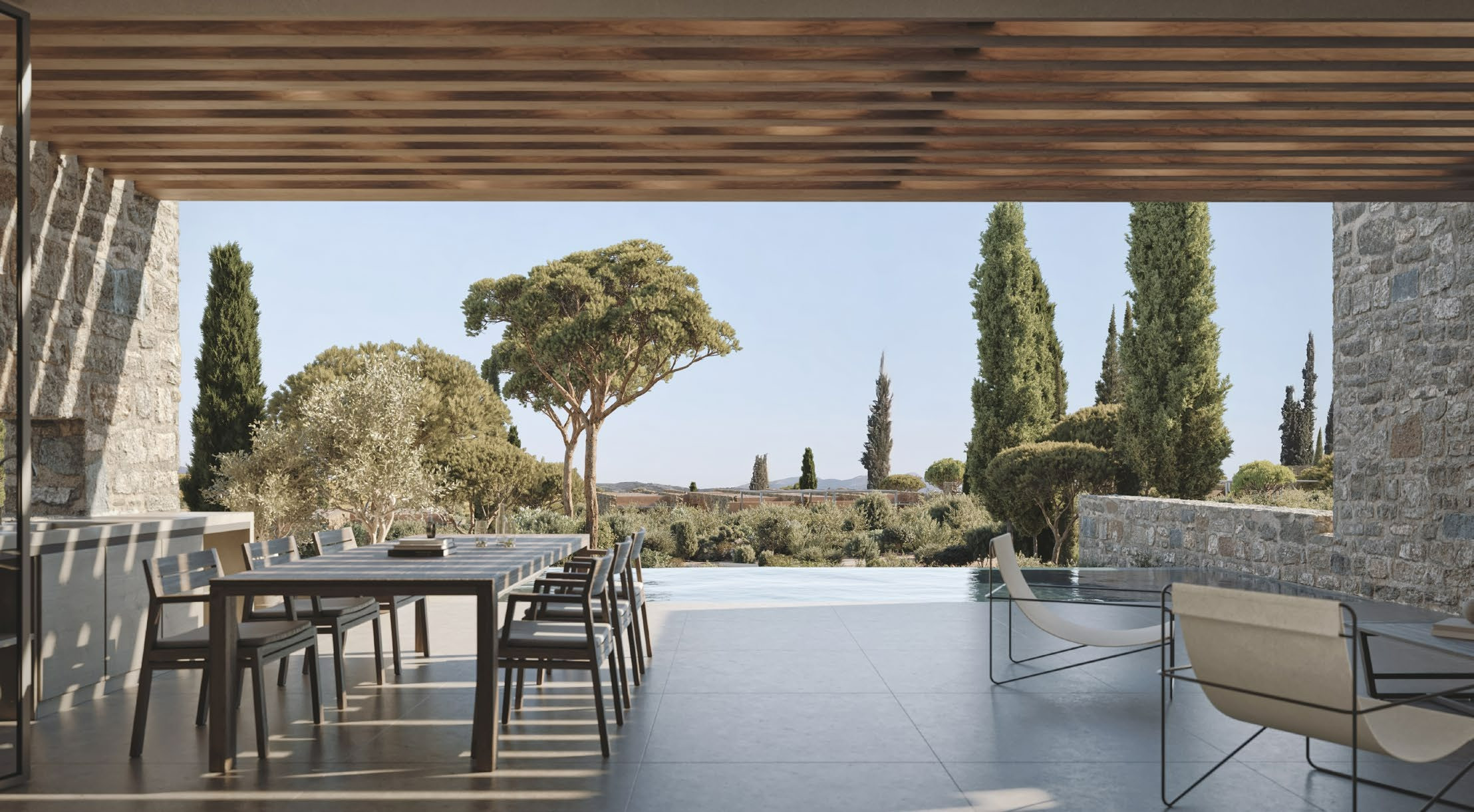is situated on the third row of the Valley Greens neighborhood in Navarino Dunes, enjoying views of the surrounding golf slopes, picturesque villages, and a 13th century hilltop fortress