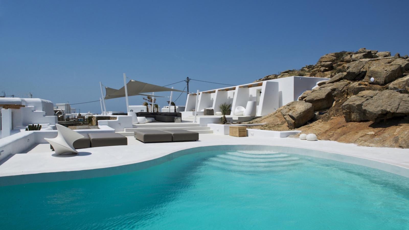 The minimal Cycladic architecture is blended with touches of modern design and all rooms evoke the serene homey feel of a private luxury villa in Mykonos.