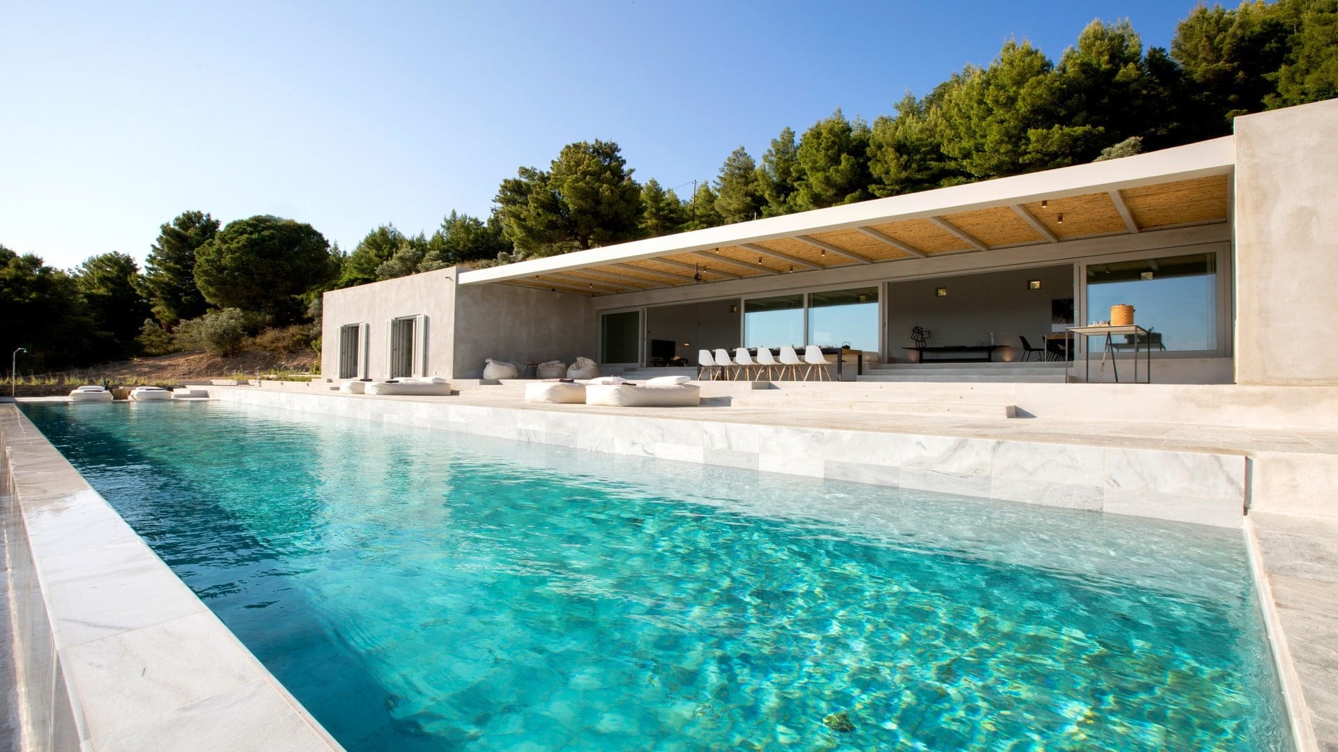 A beautiful green estate completed in 2016 and designed by the awarded greek architect Katerina Tsigarida. It has amazing views, a stunning private marble pool, surrounded by a wild forest with private access to a sandy beach.