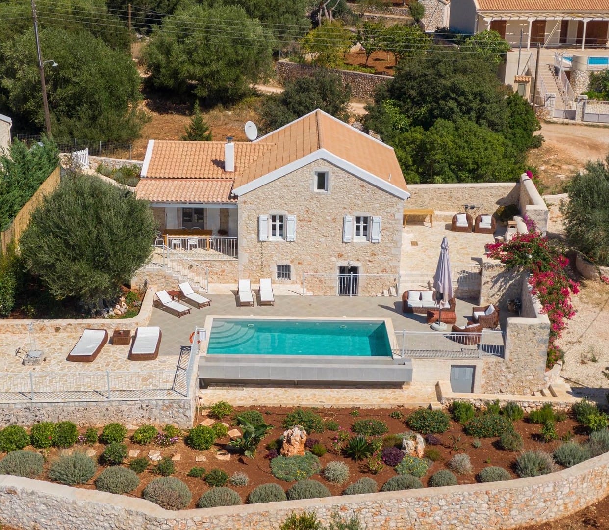 Visiting the house in late summer on a gorgeous sunny day, the house was looking at its best. The pool has a great terrace with sun loungers for everyone is surrounded by old olive trees, and there are two different seating areas from which to enjoy the spectacular sunsets.
