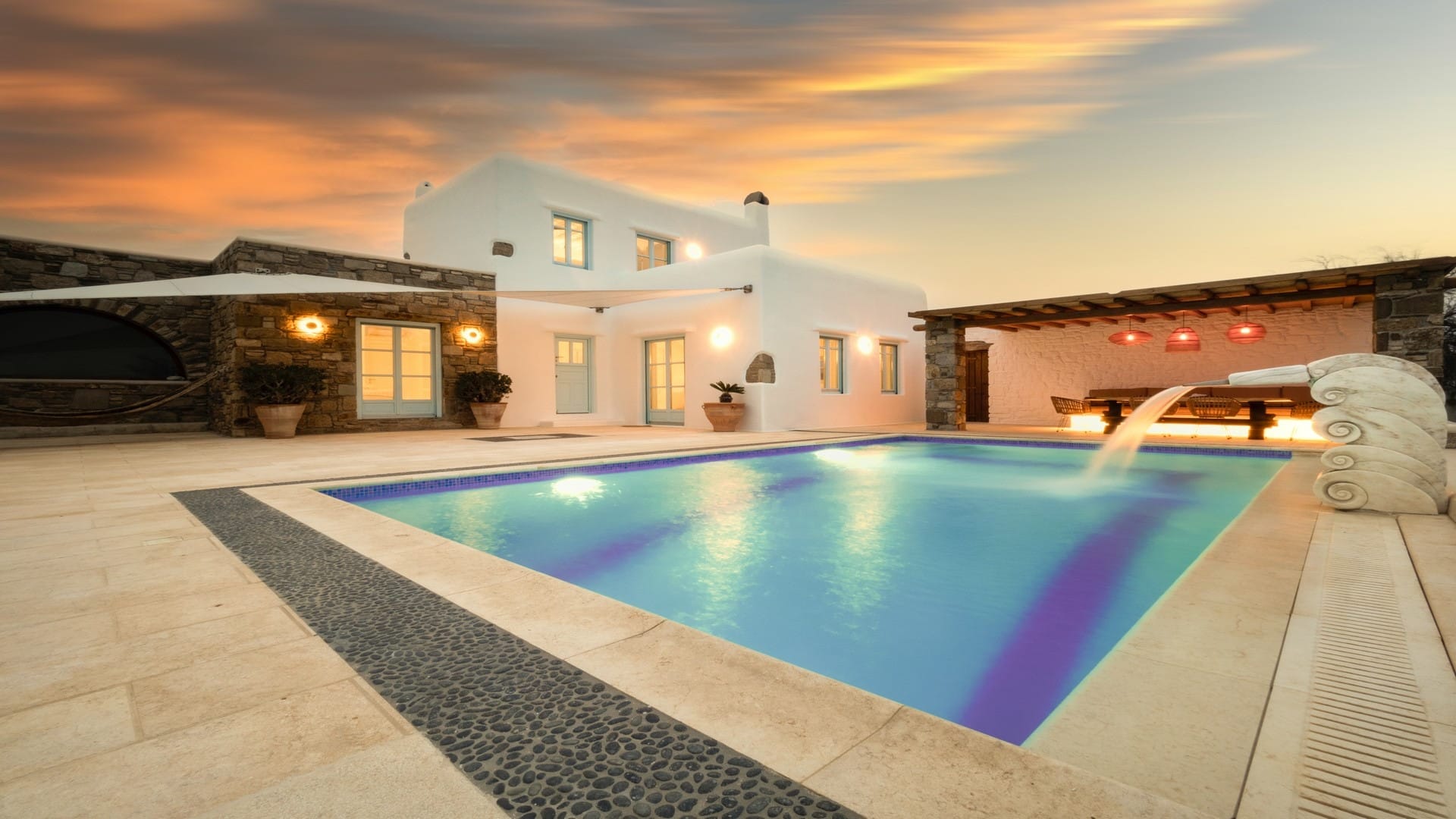 Villa Julie is a brand new villa Located 1km away from Psarou beach 4mins drive from Mykonos town. Villa Julie provides 2 en-suite bedrooms and can comfortably accommodate 4 guests. It is divided in 2 sections.Ground floor: Living room , open big kitchen, WC. 1 en-suite bedrooms .There is a direct acces to the pergola, exterior lounge and dining area. Has 1 private swimming pool. First floor: 1 master Bedrooms, en-suite bathroom and private balcony with view over the big swimming pool.Outdoor there is a swimming pool with sunbeds , a pool shower, dining area and gas bbq upon request