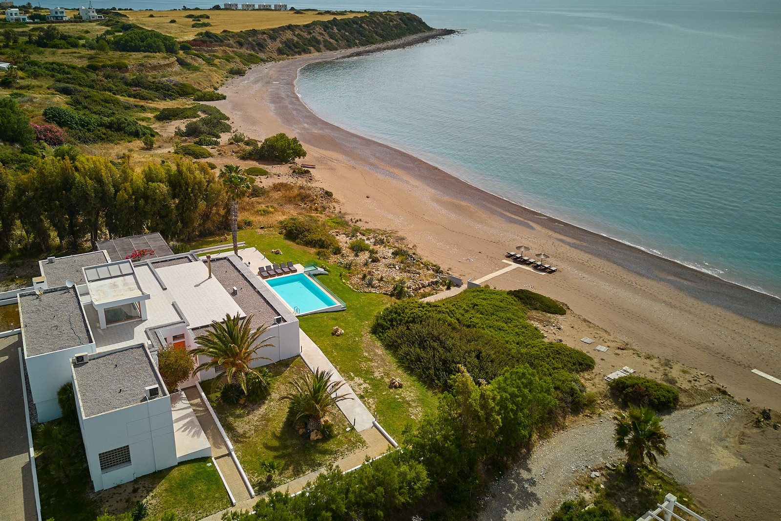 Said to be one of the most surprisingly picturesque villages on the island, Lachania is situated inland, south of the island. Its picture postcard setting, remoteness and tranquility, give Lachania a special charm all of its own. The village is easily accessible by car, located 73 km from the city of Rhodes and 76 km from Diagoras International Airport. Villa Niovi is situated just outside the village, only 10 meters from a sandy-pebbled beach offering absolute privacy and great views of the aegean sea. The natural blues of sky and sea combine to provide a canvas of natural wonder for your holiday.