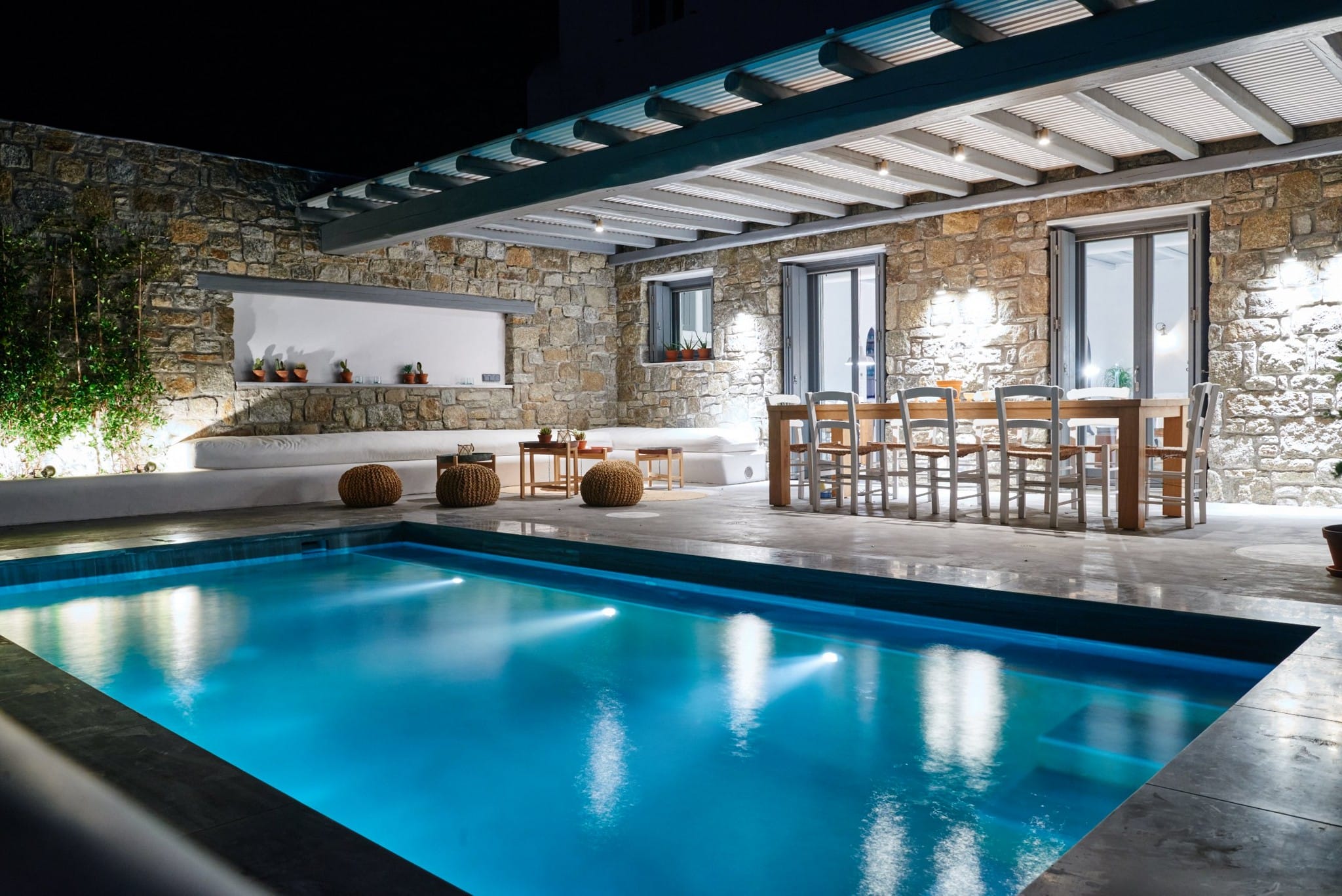 The villa has a welcoming and homey feeling, and is fully equipped with kitchen appliances, entertainment systems, books, magazines and accessories, just like the home of a good friend that has been prepared just for you. Each room has been decorated with a personal touch with an eclectic Mediterranean style. Elegant bathrooms are also fitted with quality materials and are softly illuminated by ceiling windows for that extra touch of atmosphere. Outside there is a covered area with a large dining table, a marble heated pool and a second semi-private terrace with a smaller table and plants. All outdoor spaces face west and catch picture-perfect views of the sunset over the Cyclades.