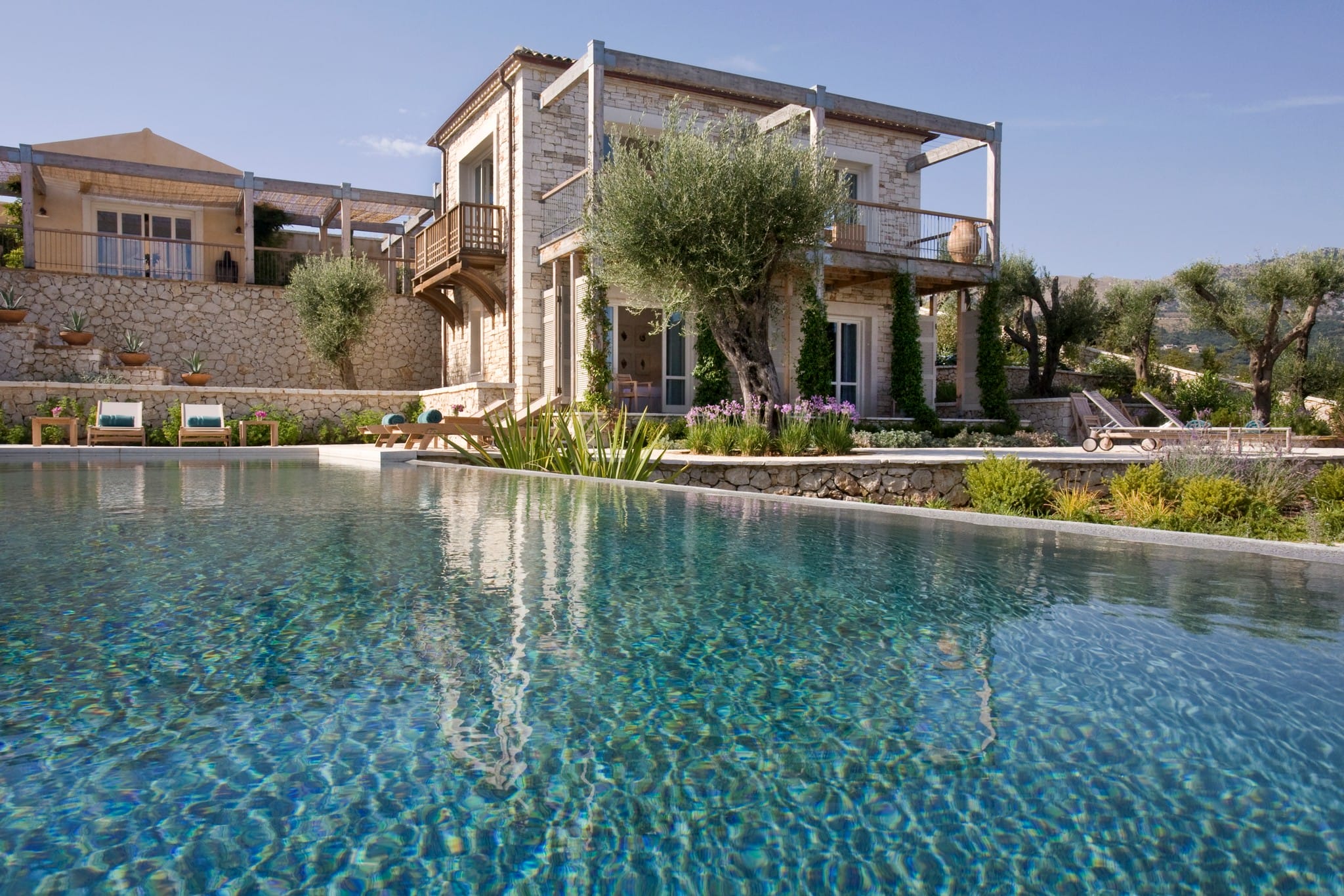 The interior is modern and stylish, pierced by large windows that let the views in and ensure that the rooms are filled with fresh air and light throughout the day. Modernist lines are blended with discrete county-chic touches to create spaces that are stylish, laid-back and modern. Low, bulky furniture are set against white walls, tall, wood-beamed ceilings and stone-paved floors, complemented by contemporary designer pieces and vintage finds. The bedrooms are country-chic and romantic, with few ornaments and vast windows that offer eye-soothing views of the sea.