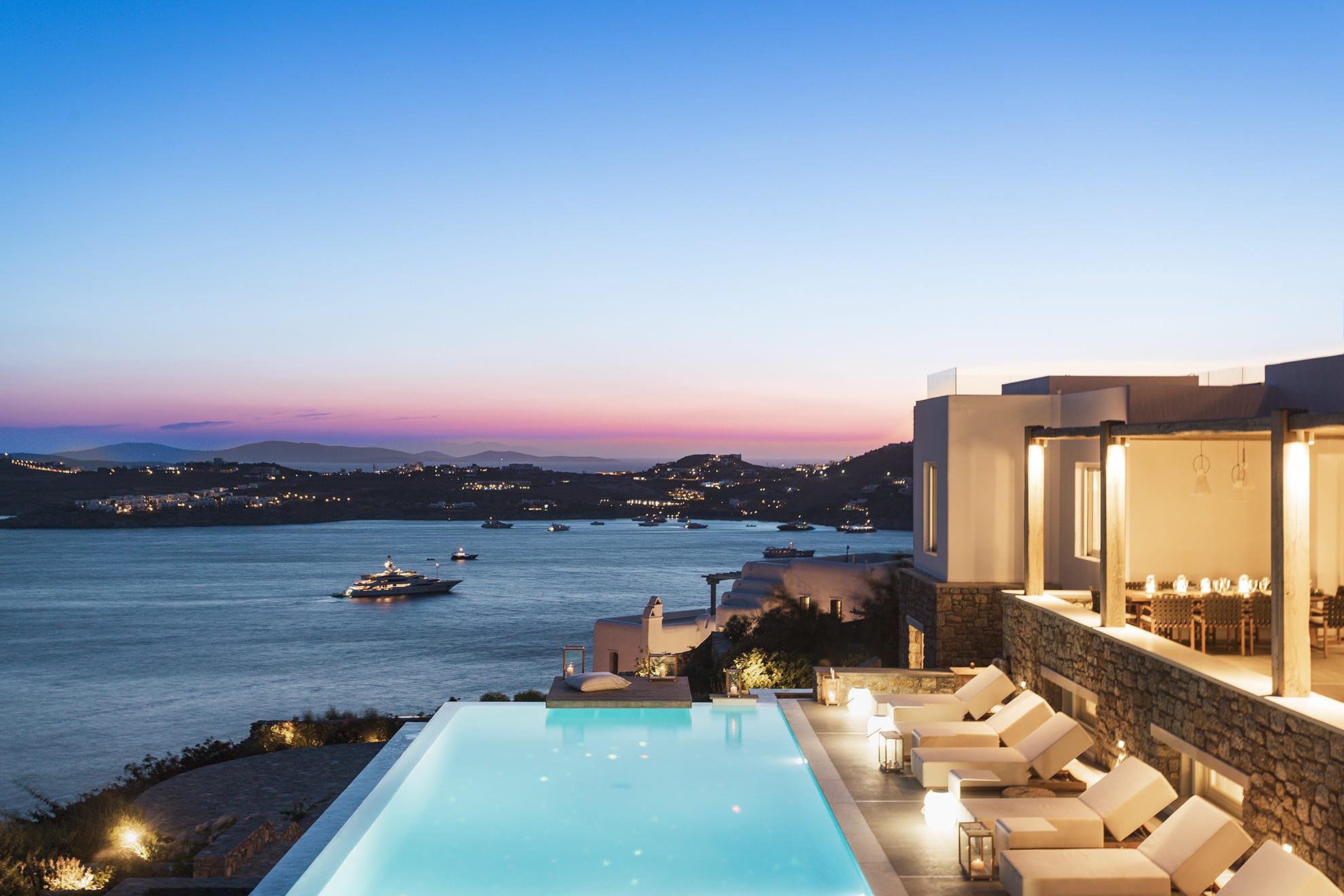 Designed by one of the most well-known and prolific Greek architects, Villa Neféli embodies the essence of elegance and comfort featuring matchless services 24/7 while the villa’s state of the art facilities will fulfill its guests every fantasy. Generously featuring seven lavish bedrooms with en suite designer bathrooms featuring amenities like steam showers, the villa offers the most modern luxury facilities to match every taste and need. An exuberant living room and dining area with panoramic view to the Aegean, a fully equipped chef's kitchen with supreme amenities, fitness area, outdoor Barbeque, outdoor Jacuzzi and billiards table in the upper private terrace, and the stylish hand crafted furniture complete the utopian hideaway. In the large outdoor area, stars sparkle from the bottom of the refreshing private infinity pool while in the clear sky the moon lights the iridescent nights. Custom sun beds and loungers offers infinite moments of relaxation under the warm sun. The unique location of the villa provides perfect shelter from the famous Mykonian winds, as well.