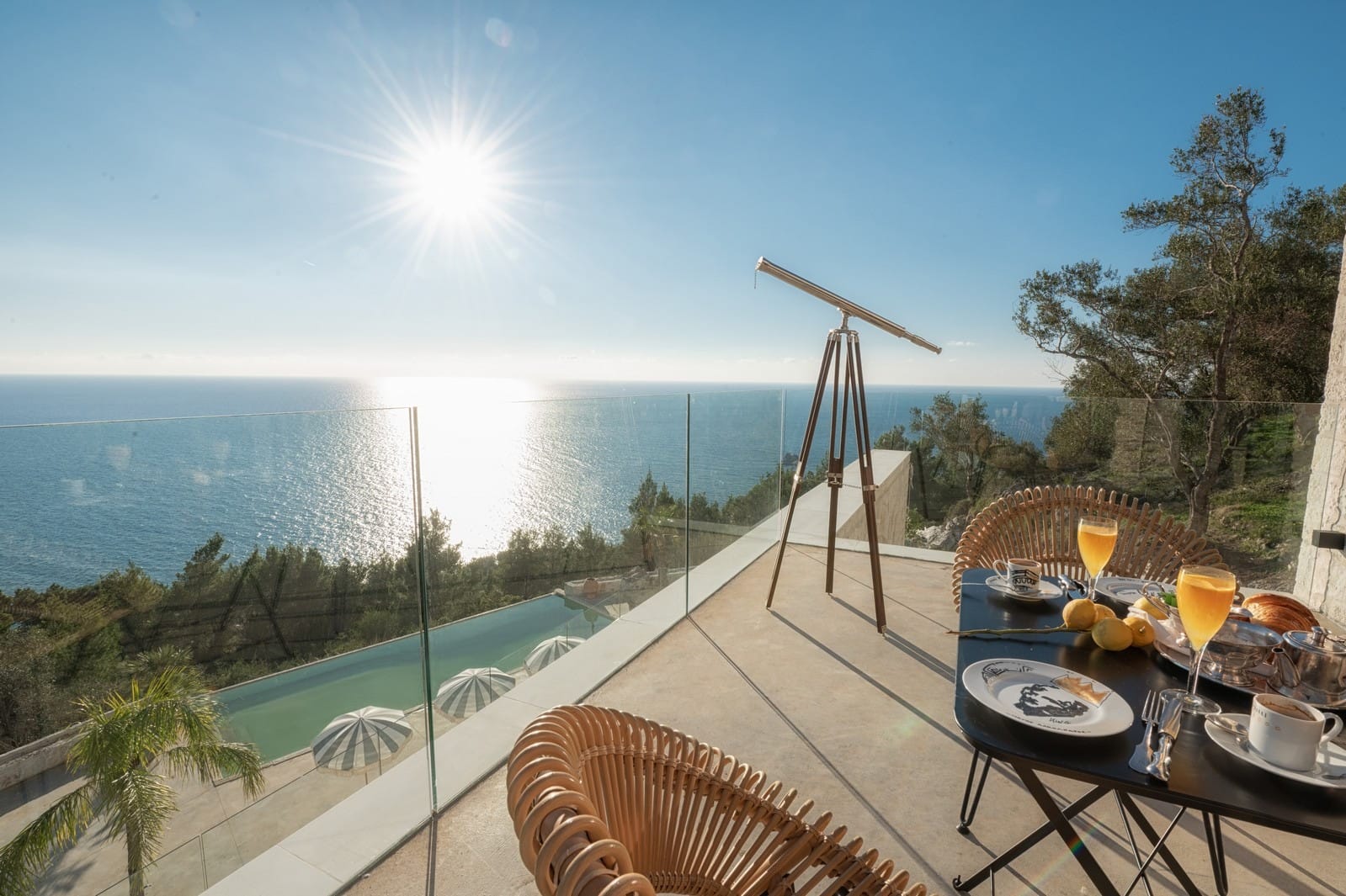 All the bedrooms have cypress wooden floors and wood beamed ceilings, giving a wonderfully perfumed fragrance. Two bedrooms have a free bathtub and a thrilling seaview. The bedrooms have a big glass arched windows that open up with access to a balcony with an incredible view to the sea and a 180-degree horizon.