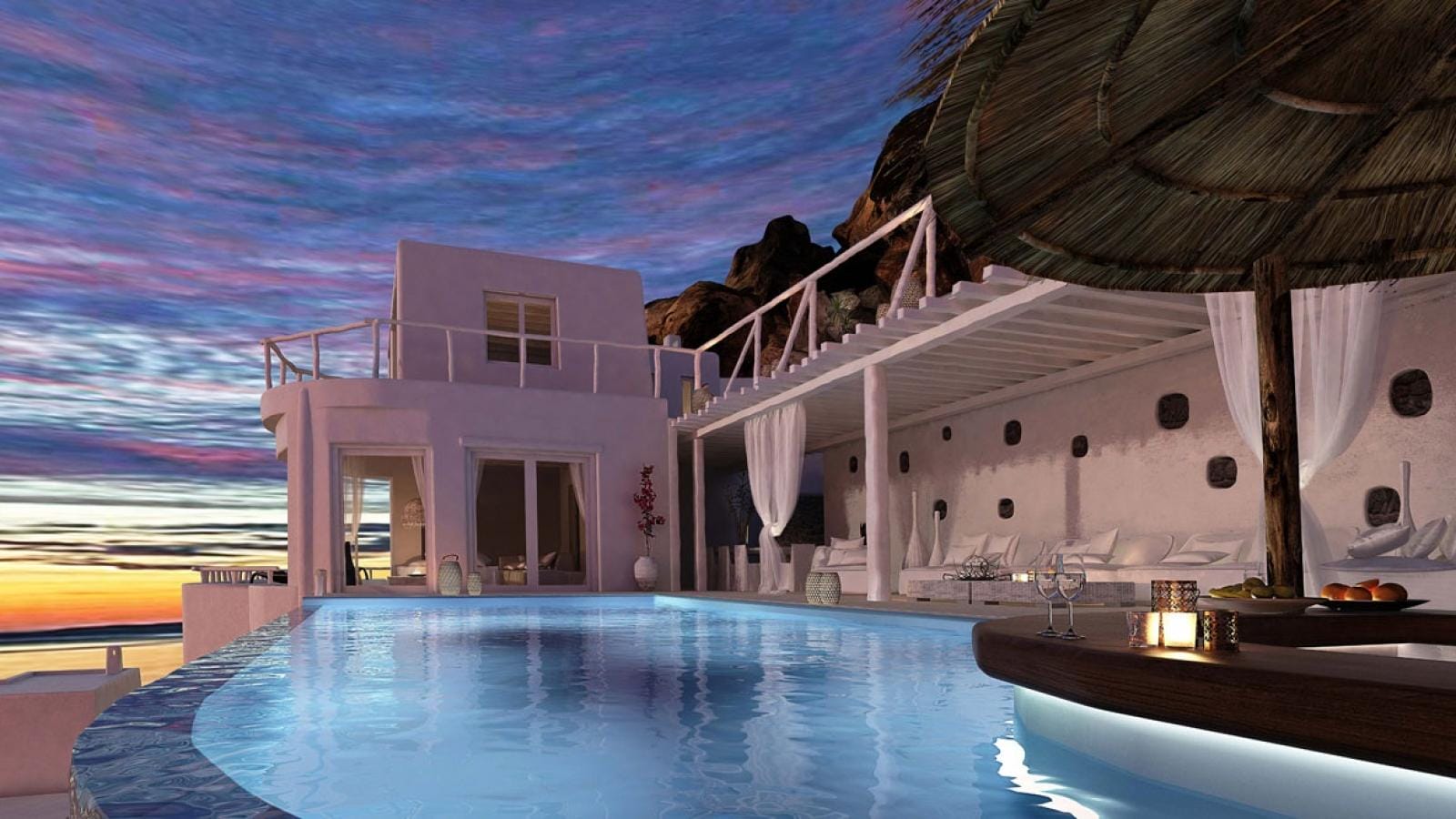 Please notice that the Villa is totally covered from the wind-which is extremely important for an island like Mykonos and it offers you an amazing view not only during the day, but during the night as well, when the city lights add some extra spark of romance to the already magnificent atmosphere.
